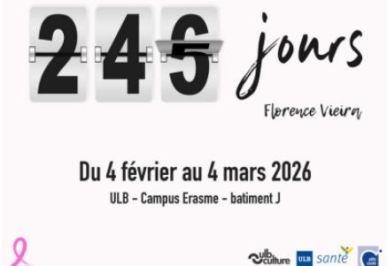 - Expo - 245 jours - lutte contre le cancer du sein15 janvier 2026245 jours est une exposition de Florence Vieira qui retrace, jour après jour, son parcours de lutte contre le cancer du sein. À travers une installation immersive et profondément intime, l’artiste donne forme au temps suspendu de la maladie, à l’attente, à la peur, mais aussi à la résistance et à la reconstruction.