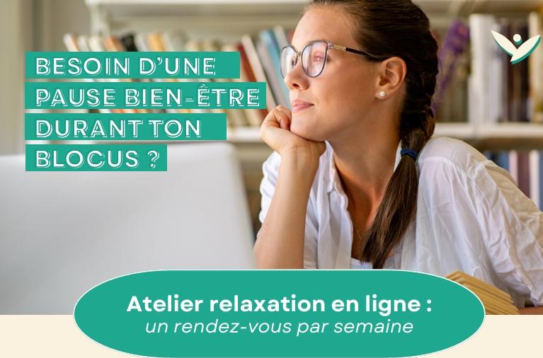 - Ateliers relaxation en ligne - 1h par semaine pendant le blocus printemps 202617 avril 2026Les ateliers de relaxation sur teams reviennent en mai et juin. Un petit rendez-vous bien-être de 1h facile à placer dans votre agenda malgré le blocus !