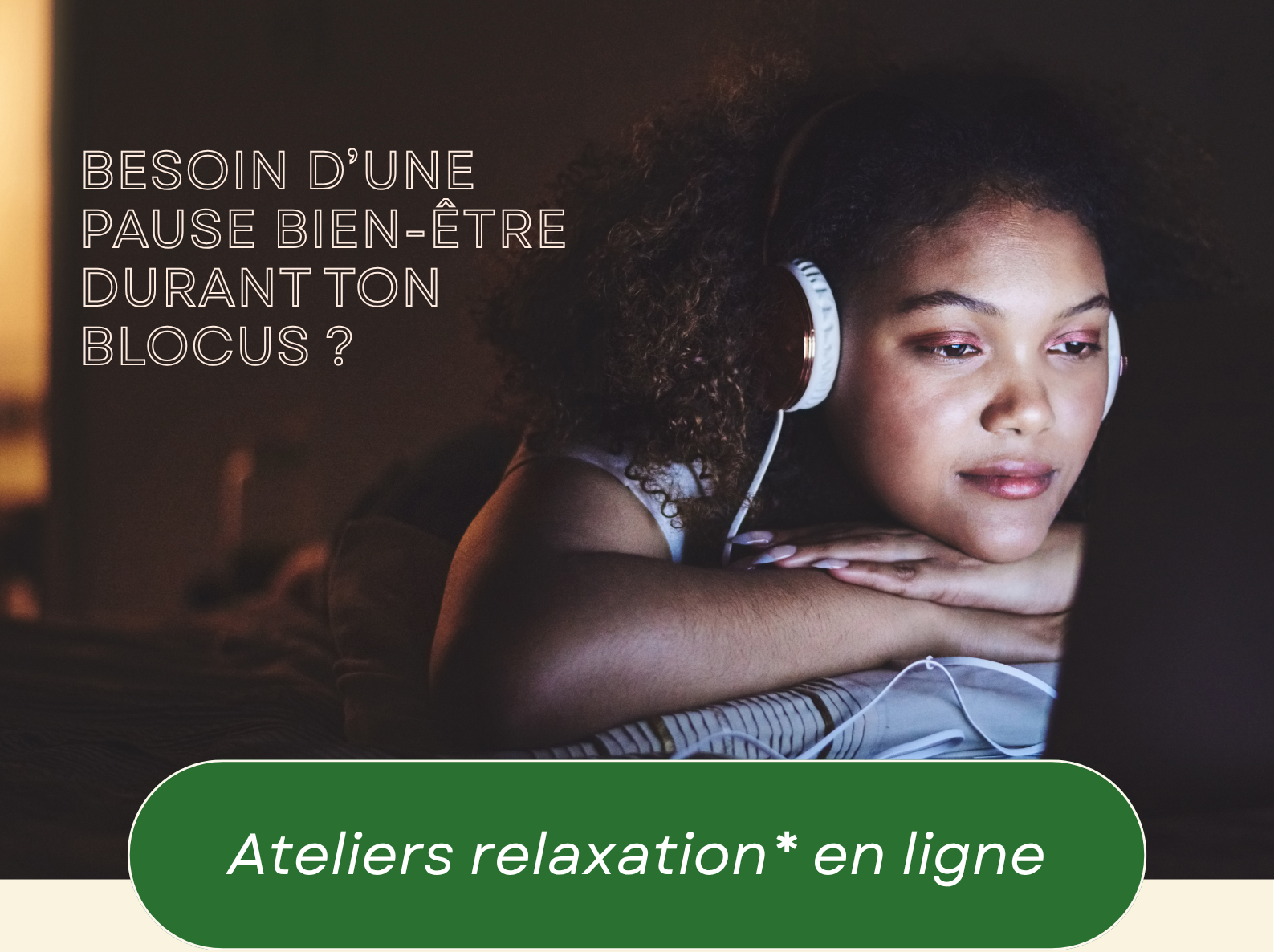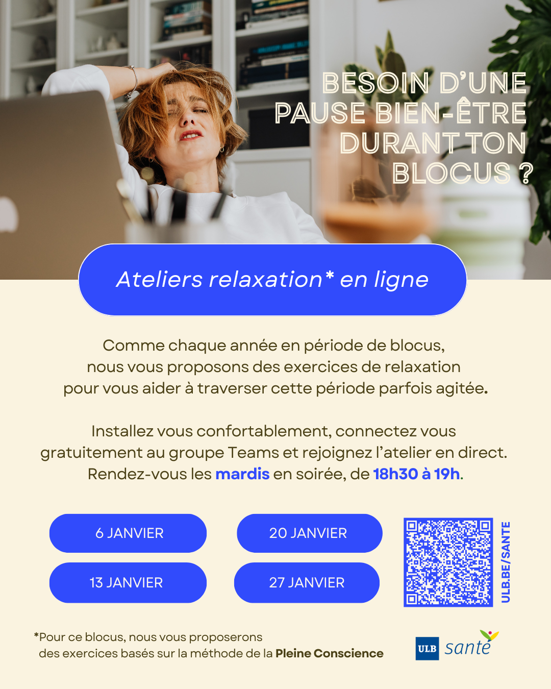 - Ateliers relaxation en ligne - 1h par semaine pendant le blocus d'hiver17 novembre 2025Les ateliers de relaxation sur teams reviennent endécembre. Un petit rendez-vous de 1h facile à placer dans votre agenda malgré le blocus !