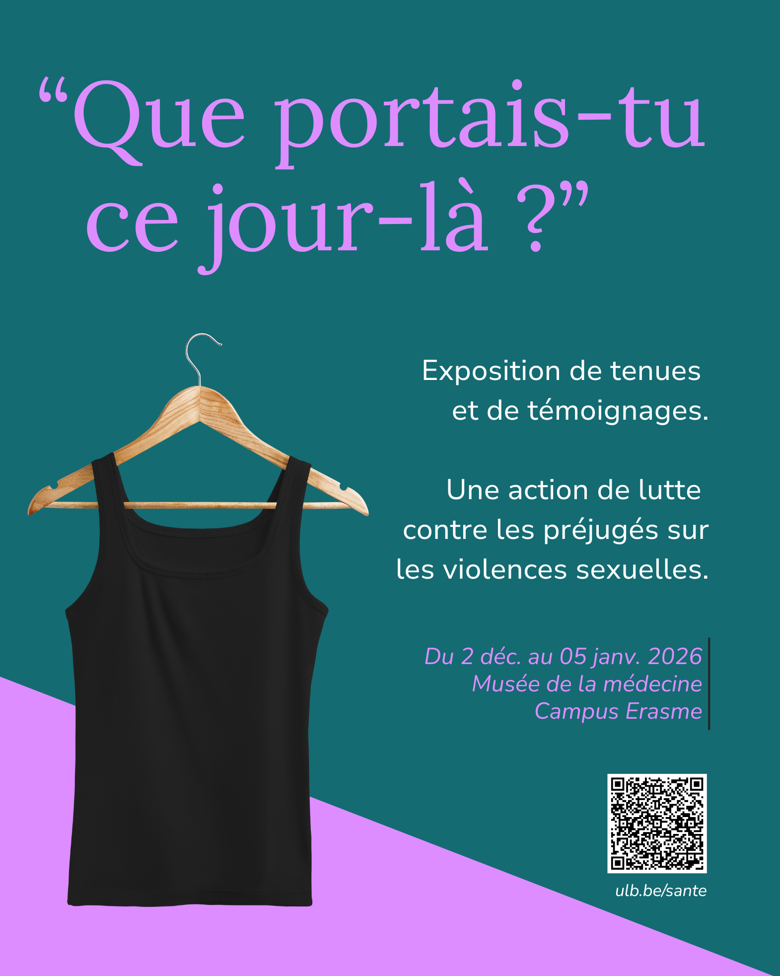 - Exposition "Que portais-tu ce jour-là?" - Action de lutte contre les violences faites aux femmes et minorités de genre20 octobre 2025ULB Santé, ULB Culture, le Musée de la médecine et les cercles étudiants de kinésithérapie et ostéopathie (CKO) ainsi que le cercle de médecine (CM) vous invitent du 2 décembre 2025 au 5 janvier 2026 à la découverte de l'exposition "Que portais-tu ce jour-là?"