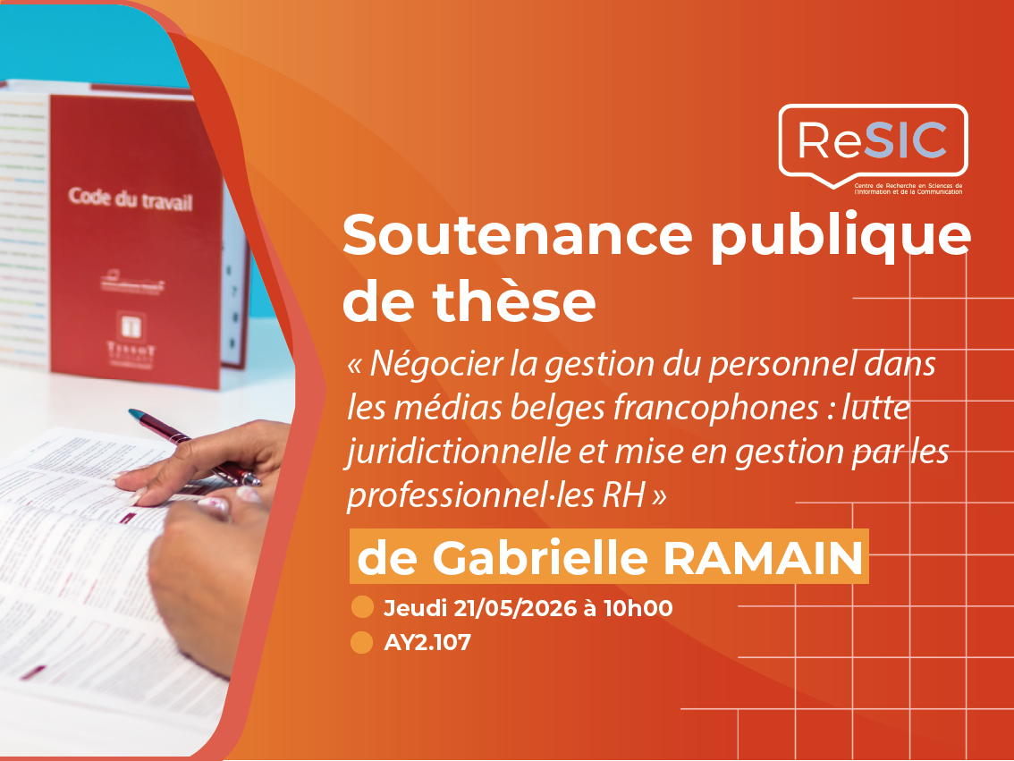 - Soutenance de thèse publique de Gabrielle RAMAIN22 avril 2026« Négocier la gestion du personnel dans les médias belges francophones : lutte juridictionnelle et mise en gestion par les professionnel·les RH »